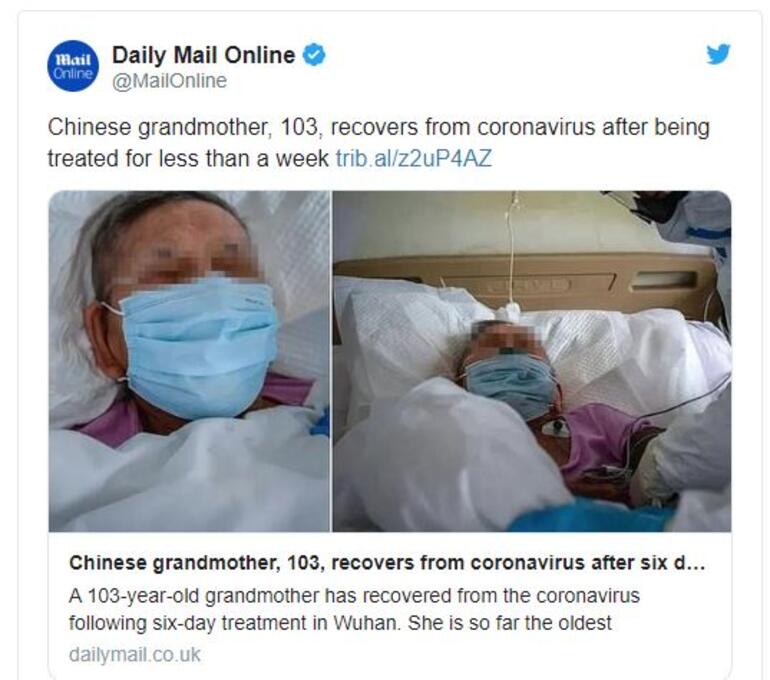 Aynı kentten bir sevindirici haber daha geldi. 103 yaşında bir kadın, altı günlük tedavinin ardından taburcu oldu. Zhang Guangfen adındaki kadın, şimdiye dek iyileşen en yaşlı kişi ünvanını aldı. Daha önce 101 yaşında bir kişi iyileşmişti.