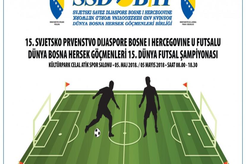 Bosna Hersek Sivil İşler Bakanlığı, Bosna Hersek İnsan Hakları ve Mülteciler Bakanlığı, İzmir Büyükşehir Belediyesi, Karşıyaka Belediyesi, Bornova Belediyesi, Bosna Hersek Fahri Başkonsolosluğu, Dünya Bosna Hersek Göçmenleri Birliği, Türkiye Bosna Hersek Kültür Dernekleri Federasyonu işbirliğiyle “Dünya Bosna Hersek Göçmenleri 15. Dünya Futsal Şampiyonası” düzenlenecek. 05 Mayıs 2018 Cumartesi günü İzmir’de yapılacak uluslararası şampiyonaya 12 ülkeden takımlar katılacak. Kültürpark’taki Celal Atik Spor Salonu’nda yapılacak şampiyonada Bosna Hersek, Avusturya, Belçika, Danimarka, İngiltere, Hollanda, Hırvatistan, İtalya, Almanya, Norveç, İsveç ve Türkiye’den takımlar mücadele edecek.