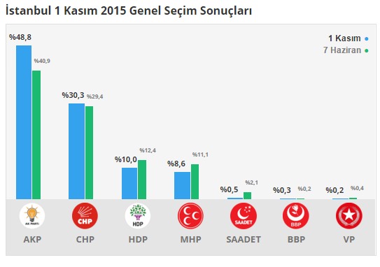 İstanbul'da 7 Haziran'da yüzde 40 alan AK Parti, 1 Kasım'da oy oranını yüzde 49'a çıkardı. CHP yüzde 29'dan yüzde 30'a çıkardı. MHP yüzde 11'den yüzde 8,5'e düştü. HDP ise yüzde 12'den yüzde 10'a düştü.