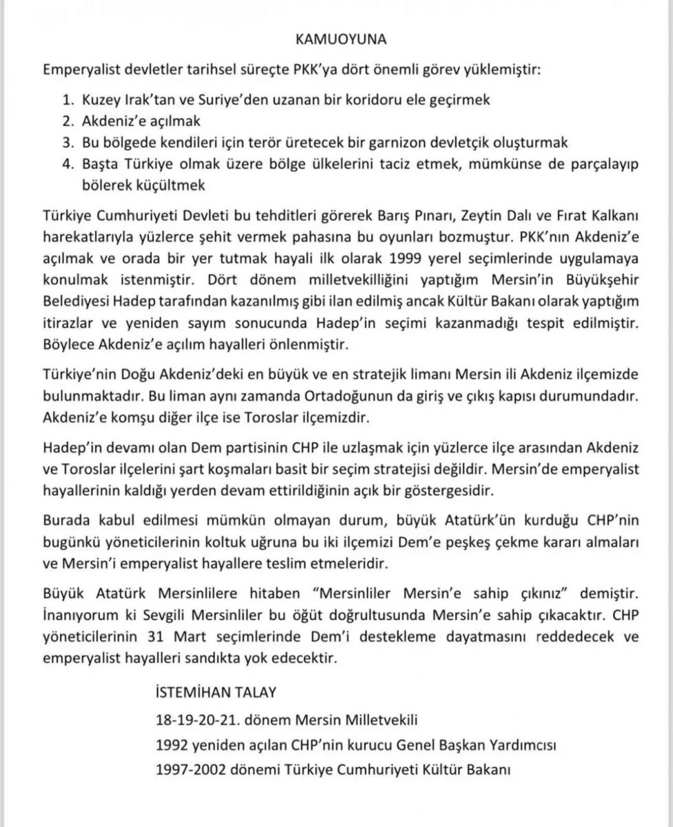 Akdeniz ve Toroslar ilçelerinin DEM Parti'ye bırakılmasına veryansın eden Talay, "CHP'nin bugünkü yöneticilerinin koltuk uğruna bu iki ilçemizi DEM'e peşkeş çekme kararı almaları ve Mersin'i emperyalist hayallere teslim etmeleridir." dedi.