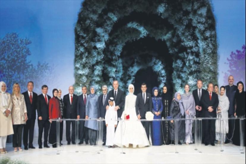 Cumhurbaşkanı Recep Tayyip Erdoğan’ın kızı Sümeyye Erdoğan ile Selçuk Bayraktar, binlerce kişinin katılımıyla düzenlenen nikâh töreninde dünyaevine girdi. İstanbul Büyükşehir Belediye Başkanı Kadir Topbaş’ın kıydığı nikâhta çiftin nikâh şahitliğini 11. Cumhurbaşkanı Abdullah Gül, TBMM Başkanı İsmail Kahraman, Başbakan Ahmet Davutoğlu, Genelkurmay Başkanı Orgeneral Hulusi Akar, Bosna Hersek Devlet Başkanlığı Konseyi Başkanı Bakir İzzetbegoviç, Pakistan Başbakanı Navaz Şerif, eski Lübnan Başbakanı Saad Hariri ve Arnavutluk Başbakanı Edi Rama yaptı.Cumhurbaşkanı Recep Tayyip Erdoğan’ın kızı Sümeyye Erdoğan ile Baykar Makina’nın sahiplerinden Selçuk Bayraktar, Küçükçekmece Yahya Kemal Beyatlı Kültür Merkezi’nde 6 bin davetlinin katıldığı tören ile dünyaevine girdi. Düğün öncesi Selçuk Bayraktar, sabah saatlerinde Tarabya’daki Huber Köşkü’ne gitti ve Sümeyye Erdoğan’ı aldı. Erdoğan ile Selçuk Bayraktar, siyah renkli BMW marka gelin arabasıyla konvoy eşliğinde Tarabya’daki Huber Köşkü’nden çıktı. Beyaz bir kıyafet giyen Sümeyye Erdoğan, ön koltukta otururken aracı Selçuk Bayraktar kullandı.Helikopterle geldiGünler öncesinden hazırlıkların başladığı, geniş güvenlik önlemi alınan Halkalı’daki Yahya Kemal Beyatlı Gösteri Merkezi’ne giden çiftin ardından bölgede nikâh töreni hareketliliği de başladı. Davetliler Basın Ekspres Yolu’ndaki Güneşli Köprüsü’nü kullanarak salona ulaşmaya çalıştı. Cumhurbaşkanı Recep Tayyip Erdoğan ise tören alanına eşi Emine Erdoğan, oğlu Bilal Erdoğan ve damadı Berat Albayrak ile birlikte helikopterle geldi. Helikopter yakındaki bir futbol sahasına indi. Erdoğan ailesi makam aracına binerek nikâha geldi.Siyaset, sanat, spor ve iş dünyasının yanı sıra yurtdışından da çok sayıda davetlinin katıldığı törenin saat 15.00’te başlaması planlanıyordu. Ancak yoğunluk nedeniyle tören 1 saat 15 dakika gecikmeli başlayabildi.Kuran-ı Kerim tilavetiyle başlayan nikâh töreninde Sümeyye Erdoğan ile Selçuk Bayraktar’ın hayatlarını konu alan “Sümeyye&Selçuk hatıra filmi” adıyla 25 dakikalık bir barkovizyon gösterisi yayımlandı. Filmde Sümeyye Erdoğan ve Selçuk Bayraktar’ın hayat hikâyeleri yakınlarının da anlatımıyla ekrana yansıtıldı. Çiftin okudukları okullar ve yaptıkları çalışmaların anlatıldığı filmin sonunda Erdoğan ve Bayraktar’ın nişan törenlerinden fotoğraf kareleri de yer aldı. Selçuk Bayraktar’ın yakını Mehmet Fatih Kacır, “Her zaman çok rahat, neşeli, çok konuşkan, coşkulu olan Selçuk ağabey bir anda biraz daha durgunlaşmaya, biraz daha derin düşüncelere dalmaya başladı. Biz kendisinin çok aşık olacağını düşünmüyorduk herhangi bir insana bu dünyada. Demek ki aşk onun için de kaçınılmaz bir sonmuş” dedi. Filmin sonunda bir parkta birlikte yürüyerek kuşlara simit atan çift için “Gayretleri, ümitleri, bir zorluktan diğerine geçen öyküleriyle Sümeyye Erdoğan ve Selçuk Bayraktar, şimdi el ele verdiler” ifadesi kullanıldı.8 nikâh şahidiSaat 16.15 sıralarında nikâh törenine geçildi. Sümeyye Erdoğan ve Selçuk Bayraktar konukların önüne Cem Karaca’nın “Bu son olsun” şarkısının müziği eşliğinde çıktı. İstanbul Büyükşehir Belediye Başkanı Kadir Topbaş’ın kıydığı nikâhta çiftin nikâh şahitliğini 11. Cumhurbaşkanı Abdullah Gül, TBMM Başkanı İsmail Kahraman, Başbakan Ahmet Davutoğlu, Genelkurmay Başkanı Orgeneral Hulusi Akar, Bosna Hersek Devlet Başkanlığı Konseyi Başkanı Bakir İzzetbegoviç, Pakistan Başbakanı Navaz Şerif, eski Lübnan Başbakanı Saad Hariri ve Arnavutluk Başbakanı Edi Rama yaptı.Hayat hikâyeleri yayınlandıNikâh töreninde Sümeyye Erdoğan ve Selçuk Bayraktar’ın hayat hikayelerinin anlatıldığı bir film yayınlandı. Sümeyye Erdoğan’ın binicilik sporu, bungee jumping yaptığı pek çok kişi tarafından ilk defa törendeki bu filmden öğrenildi.Nikâh törenine Demirören Holding Yönetim Kurulu Başkanı Erdoğan Demirören, Yönetim Kurulu Başkanvekili ve Türkiye Futbol Federasyonu Başkanı Yıldırım Demirören, Yönetim Kurulu Üyesi Tayfun Demirören ile Genel Yayın Yönetmenimiz Fikret Bila da katıldı.Olağanüstü güvenlik- Sümeyye Erdoğan-Selçuk Bayraktar çiftinin nikâh töreniyle ilgili hazırlıklar önceki gece boyunca sürdü. İstanbul Emniyet Müdürü Mustafa Çalışkan da, gece saatlerinde nikâhın yapılacağı yere gelerek çalışmaları bizzat yerinde denetledi. Bu sırada, bomba uzmanı polisler nikâhın yapılacağı bölgede detaylı patlayıcı madde araması yaptı.