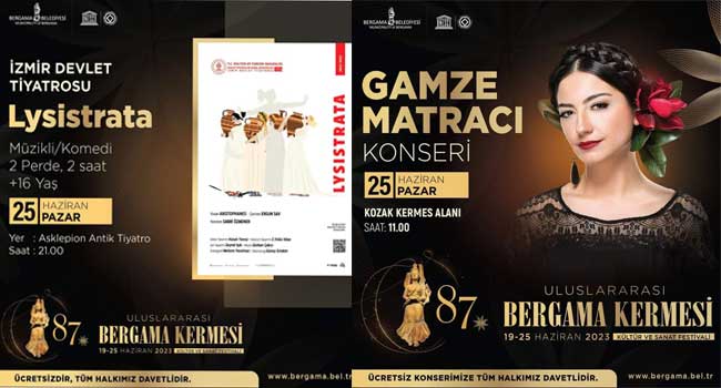Türkiye’nin ilk yerel festivali olan ve 87 yıldır aralıksız olarak yapılan Uluslararası Bergama Kermesi’nde sahne alacak olan sanatçılar netleşti. Hadise, Orhan Hakalmaz, Sefo, Yüksek Sadakat, Inna, Linet, Muazzez Ersoy, Eşref Ziya, Gamze Matracı Bergama’da sahne alacak. İzmir Devlet Tiyatrosu Lysistrata adlı müzikli oyunu ile tiyatroseverlerin karşısına çıkacak.