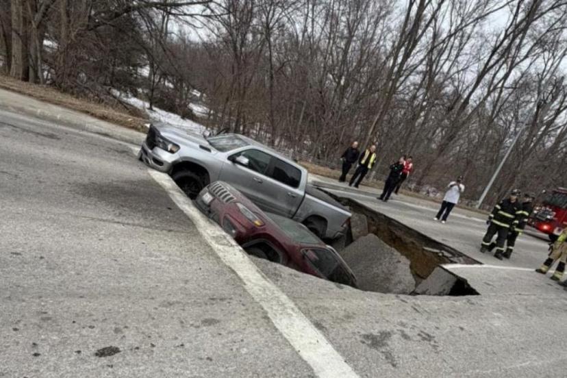 Omaha kentinde kırmızı ışıkta bekleyen iki araç, yolun çökmesiyle oluşan dev çukura düştü; sürücüler sağ salim kurtarıldı.