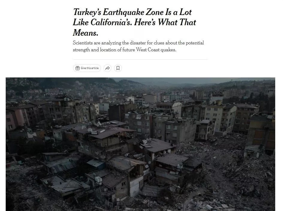 Gazetede yer alan haberde "Türkiye ve Suriye'deki güçlü depremlerinde ABD Kaliforniya'daki San Adreas Fayı ile ilgili yeni sismik bilgiler getirebilir" ifadelerine yer verildi.