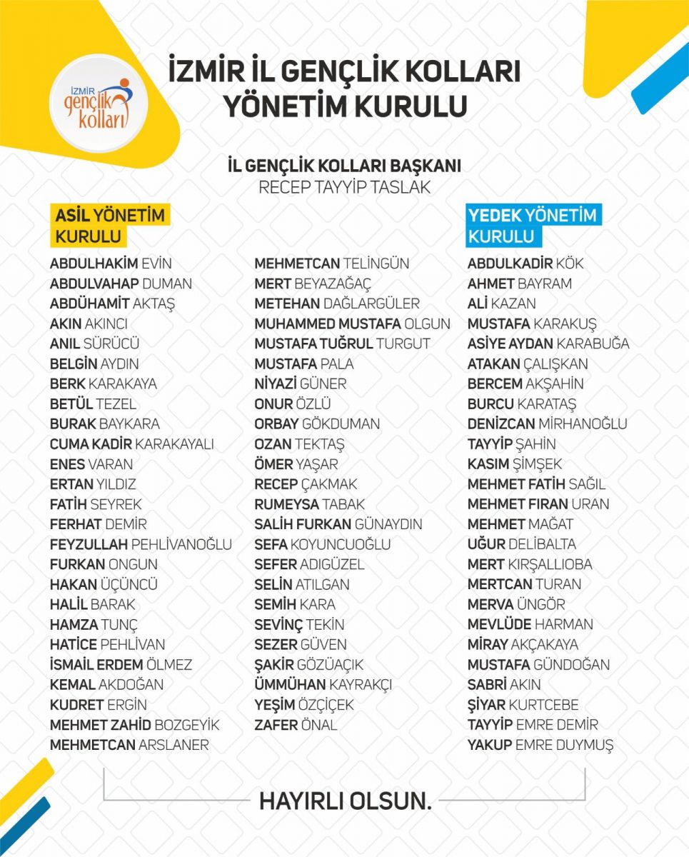 AK Parti İzmir İl Gençlik Kolları Başkan’ı Recep Tayyip Taslak, yazılı bir açıklama yaparak, yönetim kurulunu açıkladı. Başkan Taslak, açıklamasında şu ifadelere yer verdi; ‘’Uzun bir süredir heyecanlı ve dinamik günler yaşıyoruz. Başkanımız Eyyüp Kadir İnan'ın 15 Mart'ta Genel Merkez Gençlik Kolları Kongresi'nde, Türkiye'nin tüm illerinden gelen delegelerin oylarıyla Genel Başkanımız olarak seçilmesinden sonra, biz de, bugün, yeni il yönetim kurulumuzu açıklıyoruz. Büyük bir titizlikle mülâkat sürecimizi yürüttük. Başvuru formumuzu dolduran adaylarla tek tek il binamızda görüştük. Yaklaşık bin başvuru vardı ve tüm başvuruları değerlendirdik. Bir hafta boyunca, mülâkat ekibimizle birlikte, 7/24 görüşmeler yaptık.