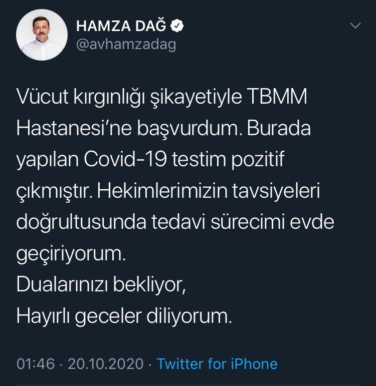 "Vücut kırgınlığı şikayetiyle TBMM Hastanesi’ne başvurdum. Burada yapılan Covid-19 testim pozitif çıkmıştır. Hekimlerimizin tavsiyeleri doğrultusunda tedavi sürecimi evde geçiriyorum. Dualarınızı bekliyor, Hayırlı geceler diliyorum."