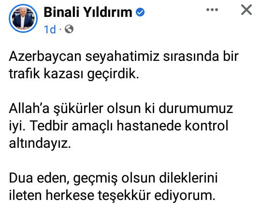 Bakan Koca, "Azerbaycan ziyaretinde olan Sn. Binali Yıldırım'ın korumasıyla milletvekili arkadaşımız Şamil Ayrım'ın da bulunduğu aracı kaza yaptı. Kendisiyle görüştüm. Üçünün de sağlık durumunun iyi olduğunu, kazayı hafif atlattıklarını öğrendim. Tekrar geçmiş olsun dileklerimi sunuyorum." dedi.