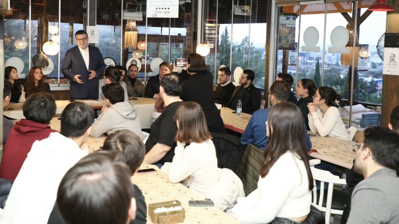 AK Parti İzmir İl Başkanı Bilal Saygılı, Ekonomi Üniversitesi Siyaset Platformu Kulübü’nün konuğu oldu. Platform üyesi gençlerin sorduğu, Başkan Saygılı’nın yanıt verdiği buluşmada birbirinden çarpıcı başlıklar gündeme geldi. Saygılı, gençlerin kentsel dönüşümden, CHP’nin İzmir’de ceketimizi koysak kazanırız yaklaşımına, yatırımların engellendiği algısına kadar pek çok konudaki sorusunu içtenlikle yanıtladı.