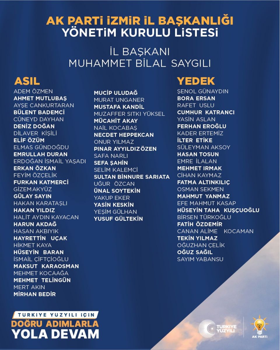 AK Parti İzmir İl Yönetim Kurulu Üyeleri şu isimlerden oluştu.