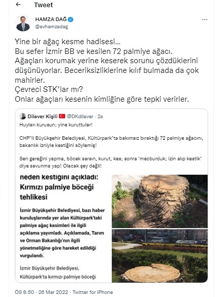 Hamza Dağ, "Yine bir ağaç kesme hadisesi…Bu sefer İzmir BB ve kesilen 72 palmiye ağacı. Ağaçları korumak yerine keserek sorunu çözdüklerini düşünüyorlar. Beceriksizliklerine kılıf bulmada da çok mahirler. Çevreci STK’lar mı? Onlar ağaçları kesenin kimliğine göre tepki verirler." dedi.