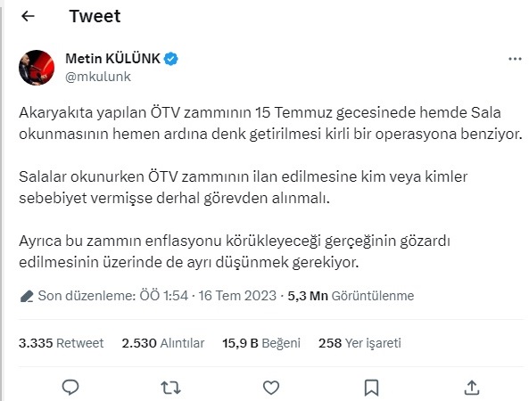 Twitter hesabından yaptığı açıklamada Külünk, "Akaryakıta yapılan ÖTV zammının 15 Temmuz gecesine hem de sala okunmasının hemen ardına denk getirilmesi kirli bir operasyona benziyor" dedi.