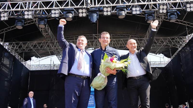 Ot ve hediyelik eşya stantlarını gezdikten sonra Hakan Aysev&Levent Gündüz’ün ‘Her Telden Notalar’ konserine katılan İstanbul Büyükşehir Belediye Başkanı Ekrem İmamoğlu konser sonrası Çeşme Belediye Başkanı Ekrem Oran’ı makamında ziyaret etti.