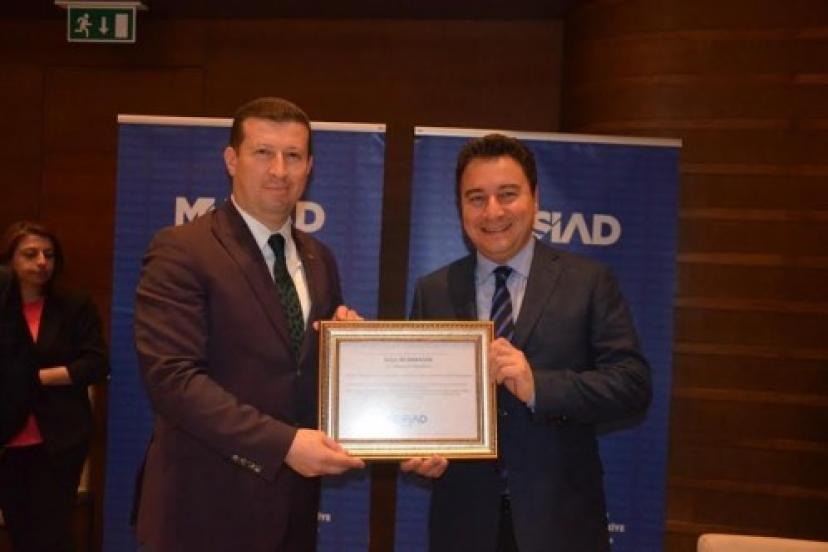 Toplantı sonunda katılımından dolayı Başbakan Yardımcısı Ali Babacan’a teşekkür eden MÜSİAD İzmir Başkanı Ümit Ülkü, MÜSİAD İzmir tarafından Gaziemir Orman Sahasında oluşturulan Hatıra Ormanında adına bağışlanmış orman fidan sertifikasını takdim etti.