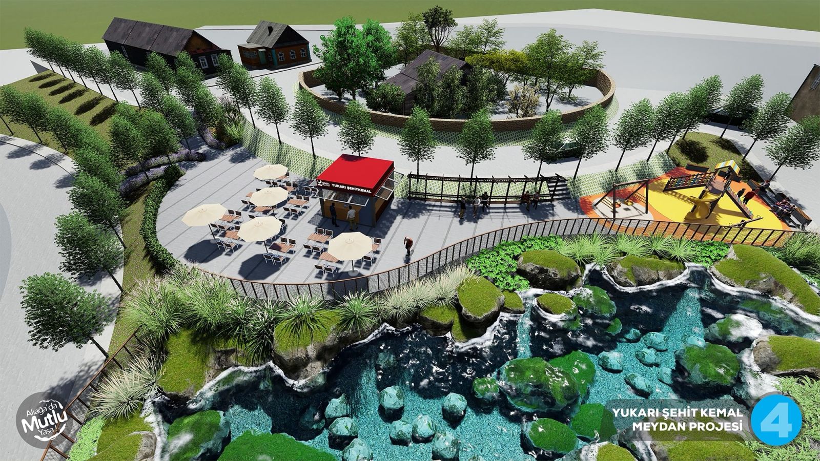 Aliağa’nın tarihi mahallelerinden biri olan Yukarı Şehitkemal’e renk katacak meydan projesi Aliağa Belediyesi tarafından kısa sürede tamamlanarak hizmete alınacak. 2.800 m2 alana sahip Yukarı Şehitkemal Mahalle Meydanı projesinde toplam 1200 m2 yeşil alan yer alacak. Mevcut alandaki dere estetik olarak iyileştirilerek görsel şölen sunacak şekilde suya dayanıklı, su kenarı bitkileri ile bitkilendirilecek. Meydanın canlı bir mahalle merkezine dönüşmesi için mini bir büfe ve özel tasarımla imal edilmiş ahşap pergole ve oturma grupları yapılacak. Proje kapsamında çocukların eğlenceli vakit geçirebilecekleri Çocuk oyun alanı da yer alıyor.