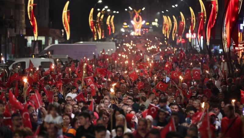 Metrelerce uzunluktaki korteje Aliağa Kaymakamı Zekeriya Güney, Aliağa Belediye Başkanı Serkan Acar, Garnizon Komutanı Albay Faruk Altun, Aliağa Cumhuriyet Başsavcısı Mehmet İmir, belediye meclis üyeleri, siyasi parti yöneticileri, sivil toplum kuruluşları ile Aliağalılar katıldı. Kortejin Avcı Ramadan Çocuk Oyun ve Rekreasyon Alanı'na varmasıyla birlikte gerçekleştirilen tekne gösterileri ilgiyle izlenirken ay yıldızlı köprüde yakılan meşaleler geceyi aydınlattı.