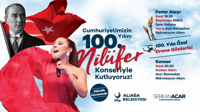Aliağa Belediyesi tarafından hazırlanan cumhuriyetin 100. yıl kutlamalarında coşku, Türk pop müziğinin önde gelen yorumcularından Nilüfer konseriyle zirveye ulaşacak. Avcı Ramadan Çocuk Oyun ve Rekreasyon Alanı’nda saat 20.30’da sahne alacak olan Nilüfer, hafızalara kazınan unutulmaz şarkılarını Aliağalılar için söyleyecek.