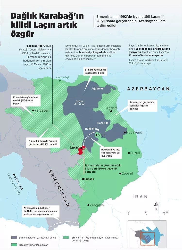 Azerbaycan Cumhurbaşkanı İlham Aliyev resmi Twitter sayfasından yaptığı açıklamada, Laçın şehrinin Azerbaycan ordusunun kontrolü altına geçtiğini duyurdu.