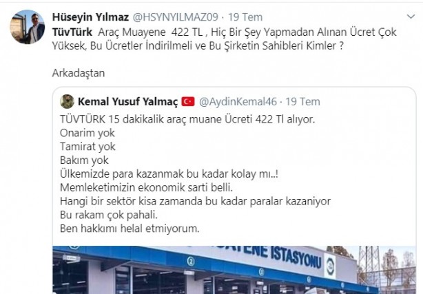 Aracı olan vatandaşların her 2 yılda bir yaptırmak zorunda olduğu araç muayenelerinde istenen fahiş ücret dudak uçuklattı. TÜVTÜRK'ün elinde olan araç periyodik bakımlarının fiyatı 422 lirayı bulunca vatandaş sosyal medyadan isyan etti. Binlerce vatandaş alınan ücretin haksız olduğunu dile getirirken yetkilileri göreve çağırdı.