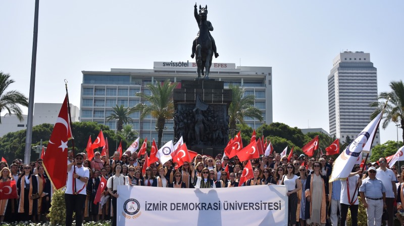 Rektör, Prof. Dr. Bedriye TUNÇSİPER’in liderliğinde üniversite öğretim üyelerinin ve idari personelinin ellerinde Türk Bayraklarıyla katılım gösterdiği “Demokrasi Yürüyüşü”, Alsancak Gündoğdu Meydanı’ndan, Cumhuriyet Meydanı’na kadar gerçekleştirildi. Cumhuriyet Meydanı’nda basın açıklaması yapan Rektör, Prof. Dr. Bedriye TUNÇSİPER, “Demokrasi Yürüyüşü” nün Türk akademisinin, demokrasiye olan inancı ve bağlılığının ifadesi olduğunu vurguladı.