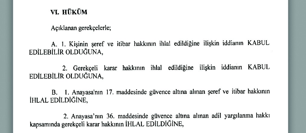 AYM’nin 11.12.2019 tarihli 2017/27041 sayılı kararında başvurucunun talepleri kabul edilerek, kişinin şeref ve itibar hakkının, masumiyet karinesinin ve gerekçeli karar hakkının ihlâl edildiği vurgulandı. Anayasanın 17. maddesinde güvence altına alınan (kişinin) şeref ve itibar hakkının ihlal edildiğine ve Anayasanın 36. Maddesinde güvence altına alınan adil yargılama hakkı kapsamında gerekçeli karar hakkının ihlal edildiğine hükmedilen AYM kararı, 6284 hakkında emsal niteliğinde.