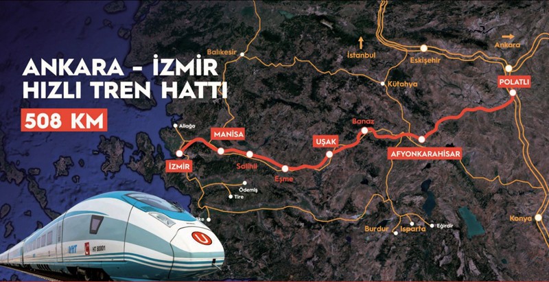 Ankara-İzmir hızlı tren projesinin tamamlanması ile mevcut demir yolu bağlantısıyla 824 kilometre olan mesafenin 624 kilometreye ineceğine dikkati çeken Bakan Uraloğlu, “Ankara-İzmir arası hat uzunluğu 624 kilometre olacak. Ancak bizim çalışmalarımız Polatlı’ya kadar mevcut olan hızlı tren hattından sonra başladığı için Ankara-İzmir Yüksek Hızlı Tren Hattı kapsamında Ankara- Banaz, Banaz-Sahilli ve Salihli-İzmir kesimleriyle toplam 505 kilometre uzunluğunda bir prestij projesi inşa ediyoruz.” dedi.