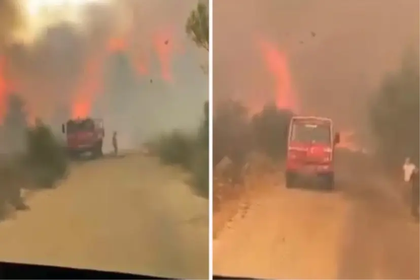 Antalya'nın Serik ilçesinde çıkan orman yangınına müdahale eden itfaiye ekipleri alevlerin arasında kalmaktan son anda kurtuldu. Korku dolu anlar cep telefonu kamerasına yansıdı.
