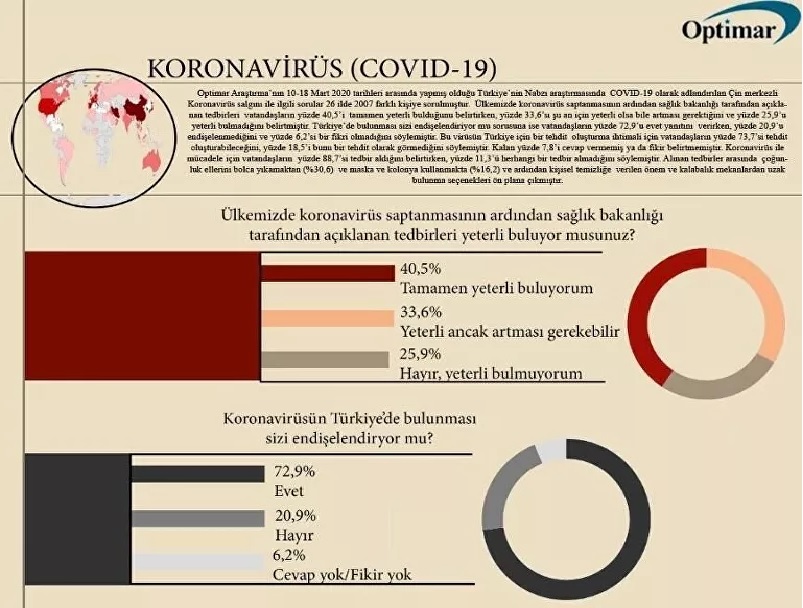 Optimar Araştırma, 10-18 Mart tarihlerinde gerçekleştirdiği ‘Türkiye’nin Nabzı’ araştırması kapsamında Çin’de başlayıp dünya geneline yayılan Kovid-19 virüsünün Türk halkına nasıl yansıdığını ortaya koydu. Şirketin 26 şehirdeki 2007 vatandaşla gerçekleştirdiği anket toplumun yüzde 72.9’unun yeni tip koronavirüsün Türkiye’ye de yayılmasından endişeli olduğunu gösterdi.