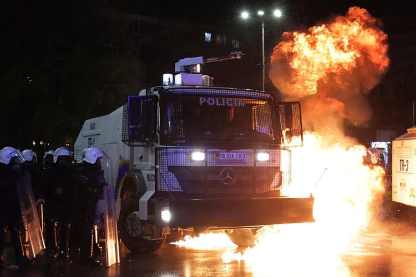 Şiddet olayları, muhalif grupların iktidar partisinin genel merkezine patlayıcı maddeler atmasıyla tırmandı. Polis, eylemcileri dağıtmak için tazyikli su ve gaz bombaları kullanırken, çatışmalar sırasında çevredeki bazı araçlar ateşe verildi. Muhalefet lideri Sali Berisha'nın da olay yerinde olduğu görüldü.