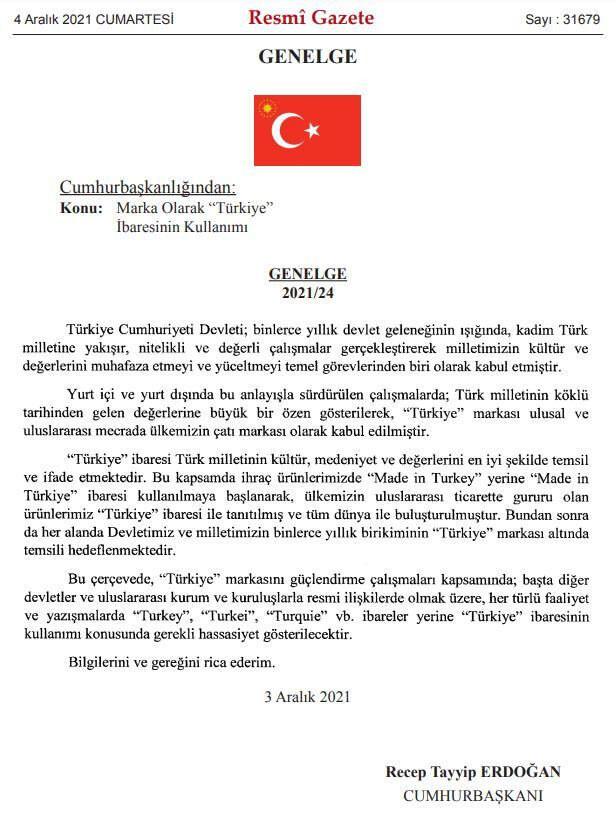 İhraç ürünlerinde, her türlü faaliyet ve yazışmalarda marka olarak "Türkiye" ibaresinin kullanılmasına ilişkin Cumhurbaşkanlığı genelgesi Resmi Gazete'de yayımlandı.