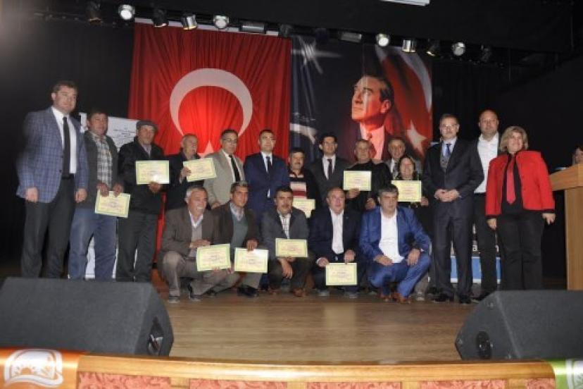 Konuşmaların ardından üreticiler sertifikalarını Vali Mustafa Toprak’ın elinden aldı. Sertifika dağıtımının ardından bir önceki yıl don afeti nedeniyle meyve bahçeleri zarar gören üreticilere fidanları dağıtıldı.