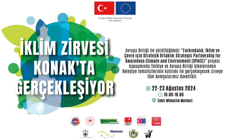Türkiye ile Avrupa Birliği arasında yürütülen Şehir Eşleştirme-II (Yeşil Gelecek için Şehir Eşleştirme) Hibe Programı (TTGS-II) kapsamında yürütülen “Farkındalık, İklim ve Çevre için Stratejik Ortaklık (Strategic Partnership for Awareness Climate and Environment) (SPACE)” projesi çerçevesinde, Türkiye ve AB ülkelerinden belediye temsilcilerinin katılımıyla “İklim Zirvesi” düzenleniyor. 22-23 Ağustos 2024 tarihlerinde İzmir Mimarlık Merkezi’nde Konak Belediyesi ev sahipliğinde gerçekleşecek zirvede başta SPACE Proje Ortakları olan Hamm Belediyesi (Almanya), Saluzzo Belediyesi (İtalya) ve Sosyal İklim Derneği olmak üzere; Gulbene Belediyesi (Letonya), Nice Belediyesi (Fransa), Barselona Belediyesi (İspanya), Vilnius Belediyesi (Litvanya), Manresa Belediyesi (İspanya), Ljubljana Belediyesi (Slovenya), Ptuj Belediyesi (Slovenya); Eskişehir Belediyesi, Nilüfer Belediyesi, Muratpaşa Belediyesi, İstanbul Büyükşehir Belediyesi, Gaziemir Belediyesi, Çiğli Belediyesi ve İzmir Büyükşehir Belediyesi temsilcileri, iyi uygulama örneklerini sunacak. Zirve, yurtdışından ve yurtiçinden katılacak belediyelerin iklim kriziyle mücadele deneyimlerini ve iklim alanındaki iyi uygulama örneklerini paylaşmaları için bir platform sağlayacak.