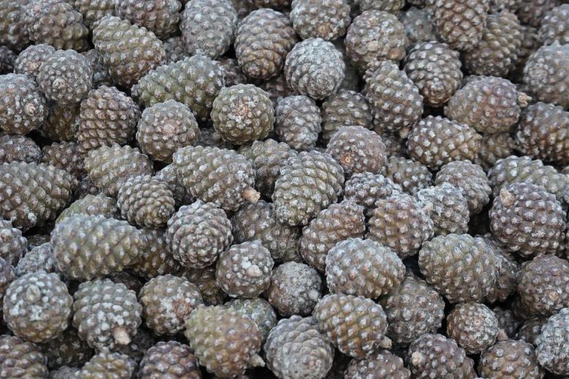 Hasat işlemi oldukça tehlikeli ve zor olmasına rağmen kozalak toplayan işçiler ölümü hiçe sayıp ağaçlara adeta bir kedi gibi tırmanırken, toplanan kozalaklar çuvallarla işleme tesislerine getiriliyor.