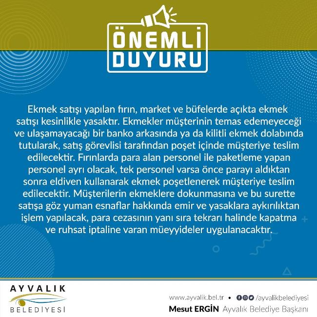 Ekmek satışı yapılan fırın, market ve büfelerde açıkta ekmek satışı kesinlikle yasaktır. Ekmekler müşterinin temas edemeyeceği ve ulaşamayacağı bir banko arkasında ya da kilitli ekmek dolabında tutularak,satış görevlisi tarafından poşet içinde müşteriye teslim edilecektir. Fırınlarda para alan personel ile paketleme yapan personel ayrı olacak, tek personel varsa önce parayı aldıktan sonra eldiven kullanarak ekmek poşetlenerek müşteriye teslim edilecektir. Müşterilerin ekmeklere dokunmasına ve bu surette satışa göz yuman esnaflar hakkında emir ve yasaklara aykırılıktan işlem yapılacak, para cezasının yanı sıra tekrarı halinde kapatma ve ruhsat iptaline varan müeyyideler uygulanacaktır.