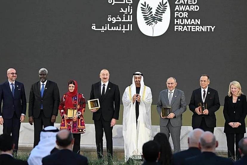 Birleşik Arap Emirlikleri Devlet Başkanı Şeyh Muhammed bin Zayed Al Nahyan’ın ev sahipliğinde düzenlenen törende, Azerbaycan Cumhurbaşkanı İlham Aliyev ile Ermenistan Başbakanı Nikol Paşinyan, ülkeleri arasındaki onlarca yıllık çatışmayı sona erdirdikleri için onurlandırıldı.