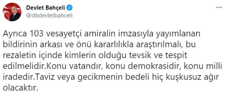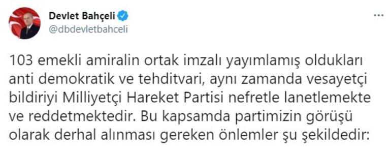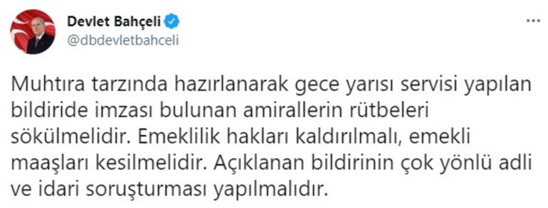 Bahçeli, emekli amirallerin açıklamasına ilişkin, Twitter'dan paylaşımda bulundu.