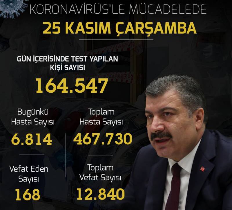 Son dakika: Sağlık Bakanlığı tarafından 25 Kasım koronavirüs tablosu, hasta, test, vefat sayısı ve son durum açıklandı. Türkiye'de son 24 saatte 164 bin 547 Kovid-19 testi yapıldı, 6 bin 814 kişiye hastalık tanısı konuldu, 168 kişi hayatını kaybetti. Bakan Koca, günlük vaka sayısının 28 bin 351 olduğunu belirtti.