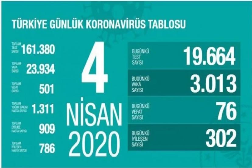 Türkiye'de son 24 saatte 3 bin 13 kişiye Kovid-19 tanısı konulduğu, 76 kişinin hayatını kaybettiği, toplam vakanın 23 bin 934'e, can kaybının 501'e, taburcu edilen hasta sayısının ise 786'ya ulaştığı bildirildi.