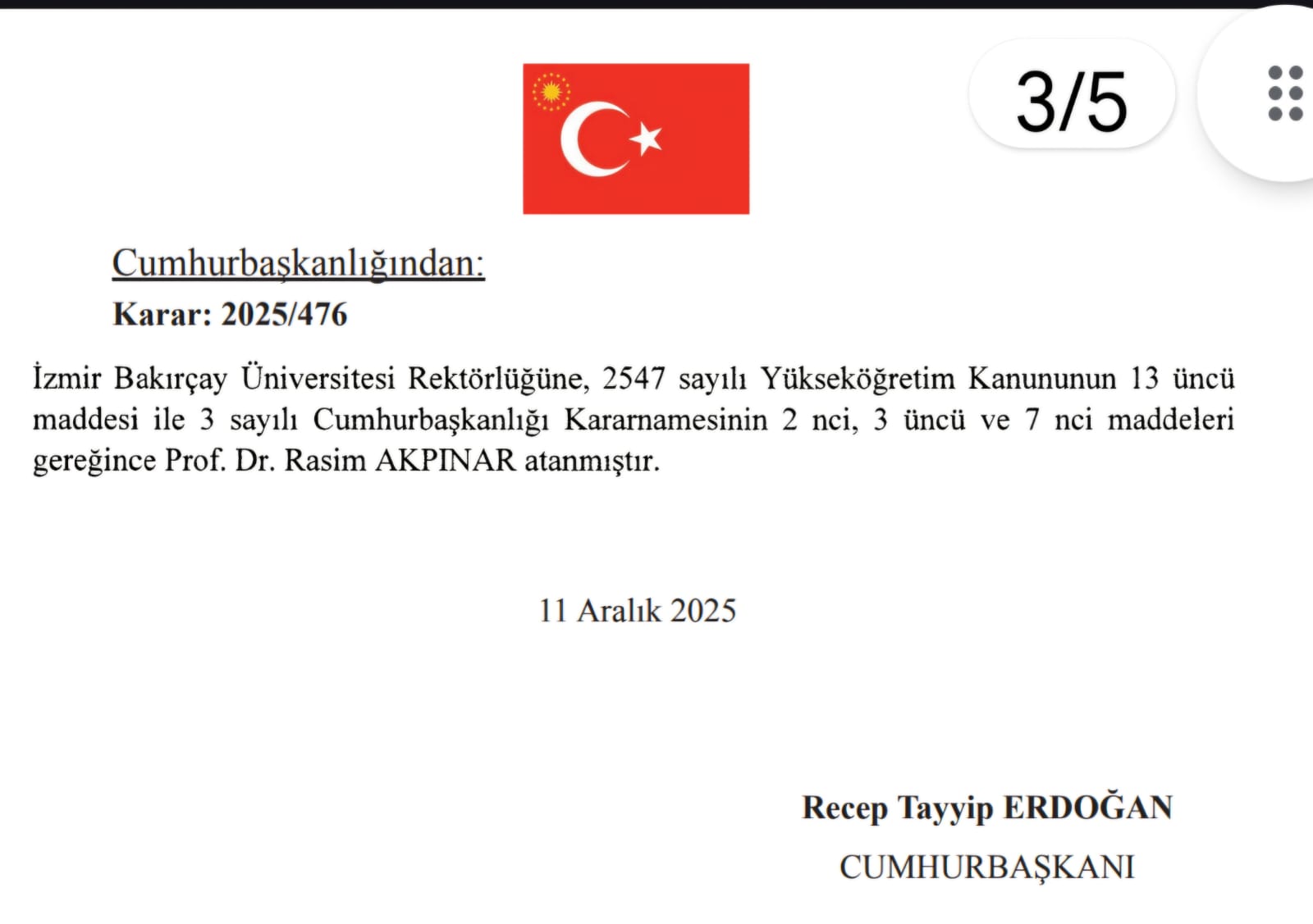 Resmi Gazete’de yayımlanan kararla dokuz üniversiteye yeni rektör ataması yapıldı. Atamalar Cumhurbaşkanı tarafından onaylanarak yürürlüğe girdi. Cumhurbaşkanı Recep Tayyip Erdoğan'ın imzasıyla yapılan atamalara ilişkin kararlar bugünkü Resmi Gazete’de yayımlandı. Beklenen atamalardan birisi olan İzmir Bakırçay Üniversitesi’ne Prof. Dr. Rasim Akpınar rektör olarak atandı.