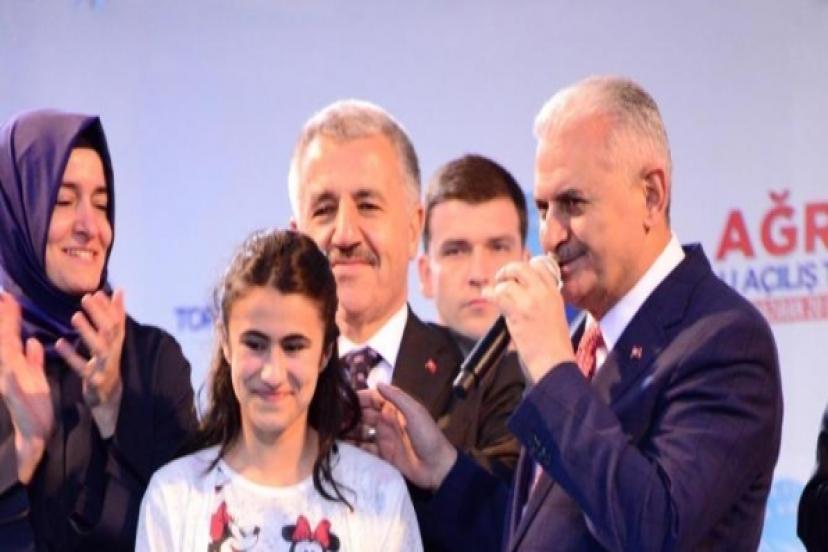 BİZ FİDAN EKİYORUZ: Biz yolları yapıyoruz teröristler yolları kazıyor patlayıcı yerleştiriyor. Ama ne yaparsa yapsın onların tehdidine Ağrı boyun eğer mi? Ağrı, doğuda Türkiye’nin birliğinin kardeşliğinin teminatıdır. Biz fidanlar ekiyoruz, onlar fidanları öldürüyor, fidanları şehit ediyor. İşte farkımız bu. ‘Duyduğumda şok yaşadım’Ağrılı Marya Polat, babasının inşaatlarda çalıştığını söyledi. Zor koşullarda elde ettiği başarının altında, disiplinli çalışmanın yattığını ifade eden Polat, şöyle konuştu: “Çapa Fen Lisesini bitirip, Çapa Tıp Fakültesi’ne geçmek ve sonrasında beyin cerrahı olmak istiyorum. Başbakanımız müjdeli haber verdi. Eğitim masraflarım hayırsever bir iş adamı tarafından karşılanacakmış. Bunu duyduğumda şok yaşadım.”