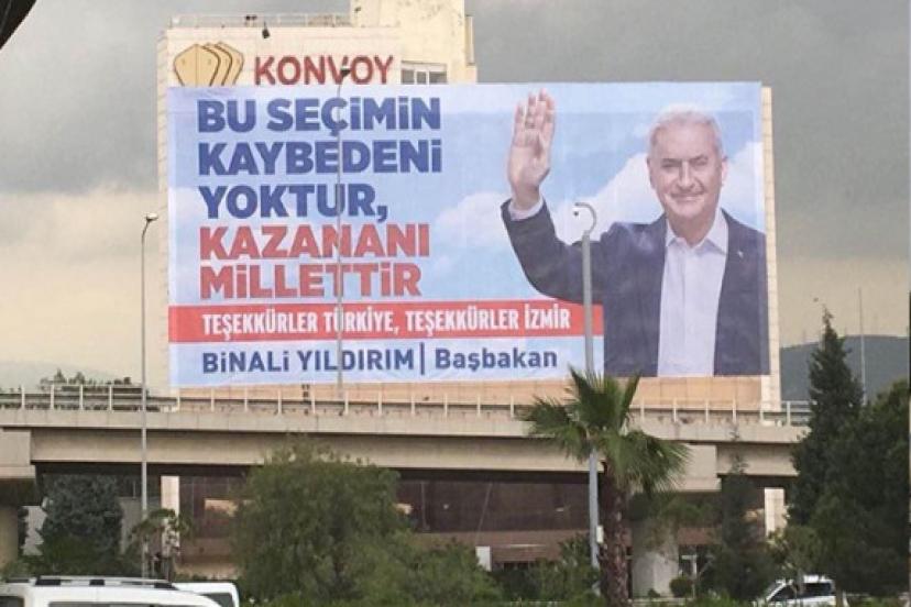 35 metre genişliğinde 16 metre uzunluğundaki afişe Bu seçimin kaybedeni yoktur, kazananı millettir. Teşekkürler Türkiye, teşekkürler İzmir. Binali Yıldırım. Başbakan" diye yazıldı. Aynı mesajla kentteki beş bina daha bu şekilde giydirilecek.