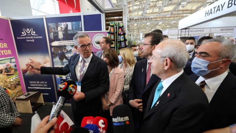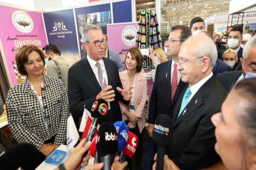 Gaziemir Belediye Başkanı Halil Arda, belediyenin standını ziyaret eden CHP Genel Başkanı Kemal Kılıçdaroğlu ve İstanbul Büyükşehir Belediye Başkanı Ekrem İmamoğlu’na projelerini anlattı. Başkan Arda, Kılıçdaroğlu ve İmamoğlu’na yaşama geçirdiği Porta Gaziemir, Sosyal Market projeleri ve ekonomik yönden dezavantajlı yurttaşlara destek vermek, kadın istihdamına katkı koymak amacıyla Gaziemir Gönüllü Kadınlar Derneği ve Gaziemir Üretici Kadınlar Kadın Girişimi Üretim ve İşletme Kooperatifi’yle birlikte yürütülen çalışmaları anlattı.