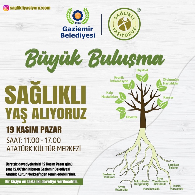.jpeg) Gaziemir Belediyesi ile Sağlıklı Yaşıyoruz iş birliğinde “Sağlıklı Yaş Alma” temalı toplantılar düzenlenecek. İlk toplantının konuşmacıları Sağlıklı Yaşıyoruz kurucuları Nurçin Çağlar ve Okan Çağlar, Sağlıklı Yaşıyoruz Danışma Kurulu’ndan doktorlar ve diğer uzmanlardan oluşacak. Doktorlar ve uzmanlar, Gaziemirlilere “sağlıklı yaşam” konusunda önemli bilgilerini paylaşacak. Sağlıklı yaş almaya dair genel bilgilendirmelerin olacağı 5'er dakikalık sunumların ardından uzmanlar, 3 saat boyunca izleyicilerin “sağlık” konularında merak ettiği soruları yanıtlayacak. Buluşmaların ilki 19 Kasım Pazar günü saat 11.00’de Atatürk Kültür Merkezi’nde yapılacak. Her ayın ikinci pazar günü düzenlenecek toplantıların sonuncusu ise 12 Mayıs Pazar günü gerçekleştirilecek. Sağlık buluşmalarında Sindirim Sistemi Sağlığı, Obezite – Diyabet, Kalp ve Damar Sağlığı, Tiroid Sağlığı – Depresyon, Kanserden Korunma ve Mücadele, Menopozu Yönetme - Prostatı Koruma konuları işlenecek. Etkinliğe katılmak isteyenler ücretsiz davetiyeleri, 12 Kasım Pazar gününden itibaren Atatürk Kültür Merkezi’nden temin edebilecek.