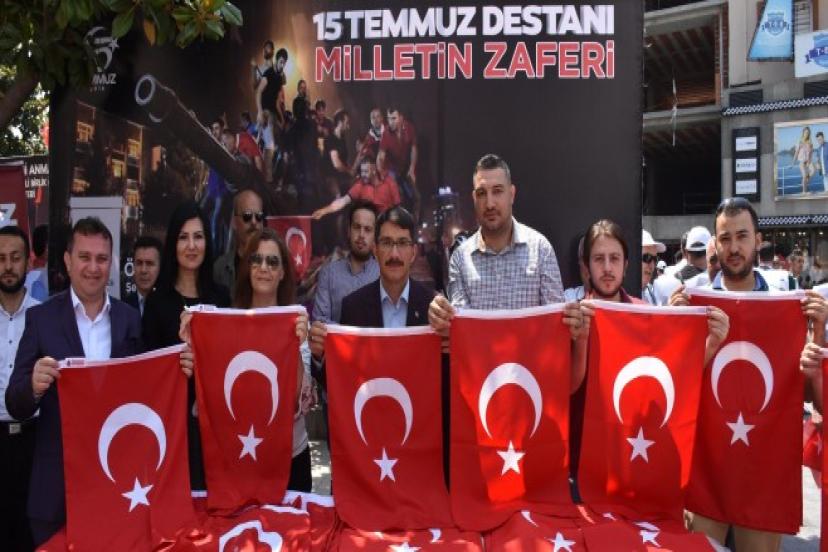 “Bu cennet vatanda bin yıldır kanlarıyla toprakları sulayan, bu vatanı bize vatan kılan tüm şehitlerimizi rahmet ve minnetle anıyorum diyen Başkan çelik açıklamasını şöyle tamamladı: “millî iradeden yana olanlar, demokrasiden yana olanlar her zaman için rahmet ve minnetle anılıyor. Ama hainler, alçaklar her zaman için nefretle anılmaya devam edilecektir. Bu alçak kalkışmanın içerisinde yer almış Türkiye düşmanı küresel güçlerin taşeronu terör örgütlerinin, militanları, yandaşları, destekçileri bugün bu milletin her bir ferdi tarafından lanetlenmektedir ve hiçbir zaman başlarını yerden kaldırıp milletimize doğru bakamayacaktır. Biz dün olduğu gibi şanlı bayrağımız ellerimizde şehitlerimize karşı olan sevgimiz, gönüllerimizde yine meydanlardayız. Çünkü biz bu ülkenin gerçek sahipleriyiz ve 15 Temmuz gecesi nasıl siyasi farklılıklarımızı bir kenara bırakarak hepimiz tek yumruk tek vücut olduysak bundan sonra da gelebilecek saldırılara karşı da tek vücut olacağımızdan kimsenin en ufak bir tereddüdü olmasın.” dedi. 15 Temmuz Demokrasi Meydanına yapılan Bayrak dağıtımına Başkan Çelik’in yanı sıra Başkan Yardımcısı Bilal Demir, Kent Konseyi Kadın Meclisi Başkanı Seher Taydaş ve Gençlik Meclisi Başkanı Fatih Gülgül katıldı.