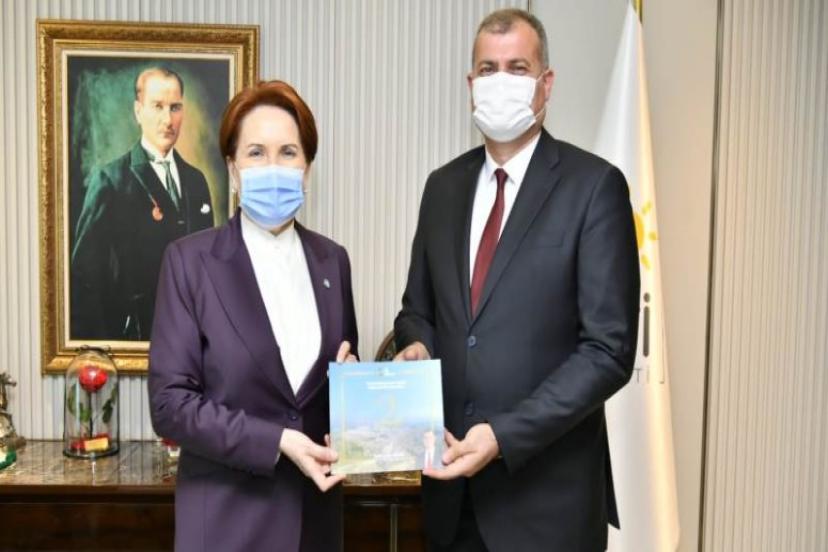 Akşener'i makamında ziyaret eden Tire Belediye Başkanı Salih Atakan Duran kendisine Tire'nin el sanatlarından oluşan hediyelerini takdim etti.