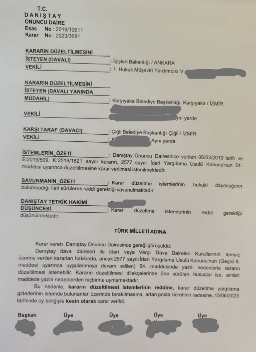 Karşıyaka Belediyesi'nin konuya ilişkin olarak Danıştay'a açtığı karar düzeltme isteminin mahkeme tarafından reddedildiğini açıklayan Gümrükçü, "Karşıyaka Belediyesi ile Çiğli Belediyesi arasında devam eden davada, lehimize olan karara Karşıyaka Belediyesi'nin Danıştay'a açmış olduğu karar düzeltme istemi mahkeme tarafından reddedilmiştir. Bu karar ile birlikte Çiğlimiz hakkı olan sınırına kavuşacaktır. Çiğli Belediyesi olarak halkımıza bu kararı duyurur, yetkilileri, tüm siyasi parti temsilcilerini ve Sivil Toplum Örgütlerini Çiğli'nin hakkını temsil eden bu kararın arkasında durmaya davet ediyoruz" dedi.