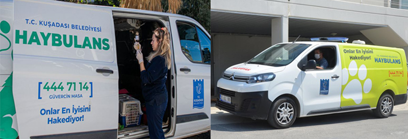 Başkan Ömer Günel, faytonları kaldırma kararının ardından sokak hayvanları için büyük önem taşıyan Haybulans hizmetini başlattı. İlki 2019 yılının Mayıs ayında, ikincisi ise 2021 yılının Nisan ayında hizmete başlayan Haybulans araçları mesafe gözetmeksizin Kuşadası'nın en ücra köşelerine kadar giderek hasta ve yaralı hayvanları yaşama döndürdü. İki veteriner hekim ile uzman personelin görev yaptığı tam donanımlı Haybulans araçları, 5 yılda 78 bin 669 hasta veya yaralı sokak hayvanına ilk müdahalede bulunarak yaşama tutunmalarını sağladı. Haybulans ekiplerinin gösterdiği özverili çalışma, hayvan severler başta olmak üzere tüm kent sakinleri tarafından takdirle karşılandı.