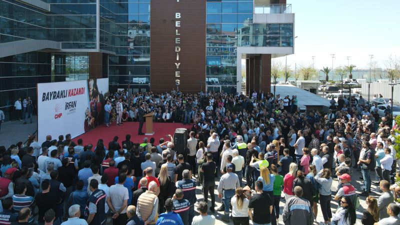 Bayraklı Belediye Başkanı İrfan Önal, Ramazan Bayramı dolayısıyla düzenlenen törende personeliyle bayramlaştı. Davul zurna eşliğinde sloganlar ve alkışlarla büyük coşkuyla karşılanan Başkan Önal, “Ben sizin üstünüz değil, çalışma arkadaşınızım. Emek veren, çalışan her arkadaşımın sonuna kadar yanında olacağım. Bayraklı için hep birlikte çok çalışacağız ve komşumuz açken yatağa tok girmeyeceğiz. Her zaman birlikte olacağız ve Bayraklı için en iyisini yapacağız. Bu vesileyle Ramazan Bayramınız kutlu olsun” dedi.