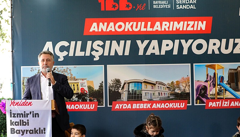 Okul öncesi eğitim çalışmaları ve eğitim yatırımlarıyla örnek olan Bayraklı Belediyesi, bünyesinde faaliyet gösteren 3 anaokulunun açılışını yaptı. Yoğun katılımla düzenlenen törende konuşan Başkan Serdar Sandal, “Eğitimde devrim yarattık. Türkiye’de ilkleri gerçekleştiren bir belediye. Atatürk’ün izinde aydınlık nesiller yetiştirirken öğrencilerimizin başarıları da hepimizin göğsünü kabartıyor. Bugün 3 anaokulumuzu açıyoruz. Temelini attığımız iki anaokulumuzun daha yapımına devam ediyoruz. Bir anaokulunun daha temelini atacağız. Hedefimiz 5 bin öğrenciye ulaşmak” dedi.