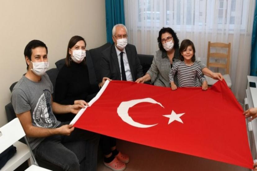 Bahadır Keskin, armağanlar arasında yer alan Türk bayrağını eşi Şükriye, oğlu Kutlay, Başkan Selvitopu ve Fügen Selvitopu’yla birlikte açarak, “Çok teşekkür ederiz. Evimizde Türk bayrağı yoktu. Bu bayrağı önümüzdeki 23 Nisan’dan itibaren asmaya başlayacağız” diye konuştu.