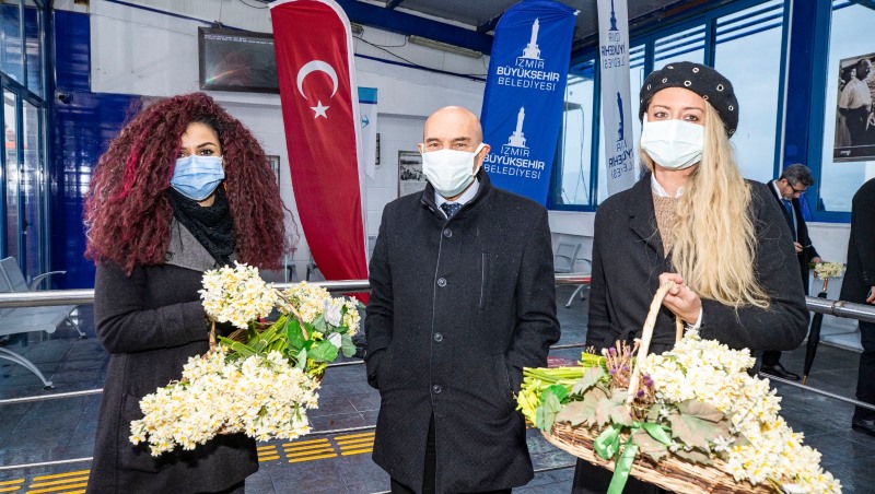 İzmir Büyükşehir Belediye Başkanı Tunç Soyer, tadilatı tamamlanarak yeniden hizmete giren Pasaport İskelesi'nin ilk yolcularını Karaburunlu üreticilerden alınan nergis çiçeği ile karşıladı.